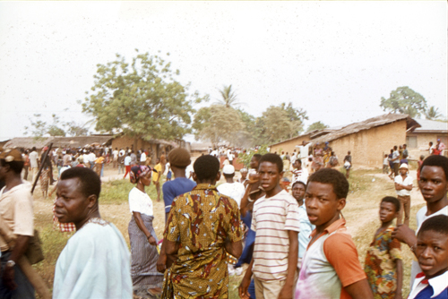 Between the stands of stumpy trees, we passed through areas of grassland. There were many small villages with crowds of children, chickens and goats all over the road. Often the massed pedestrians seemed unaware that it was a road down which they sauntered. We had been warned many times that should a motorist run over and kill a villager, the witnesses feel it is their duty to kill the motorist in return. This had happened to a taxi driver in Yaoundé. Within minutes of causing the death of a pedestrian, he had been dragged from his car and battered to death by an angry crowd of revengeful bystanders. We now passed through villages blasting our raucous air-horns. We hated to disturb the peace and startle people but if they were carrying out such impromptu executions after an accident, then we were leaving nothing to chance.