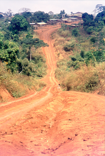 The people all live in mud or straw huts of various types. We often see children with swollen bellies which I thought was caused by malnutrition. This is very surprising considering the abundance of food all through this area. The land is very fertile but could be used much more productively. There is very little evidence of cultivation, or of work of any kind for that matter. There are only the cotton fields here, and they are not visible from the main road. There is the occasional coffee or banana plantation or rarely rubber trees. You can buy pineapples and bananas everywhere so we have been living on them. We bought four pineapples one day for about $1 each and are busy trying to eat them. They are very sweet and juicy. Tomatoes, cabbage and eggs are also relatively easy to buy although the chickens are free-ranging (all over the road!) and consequently we have had some rotten eggs.
