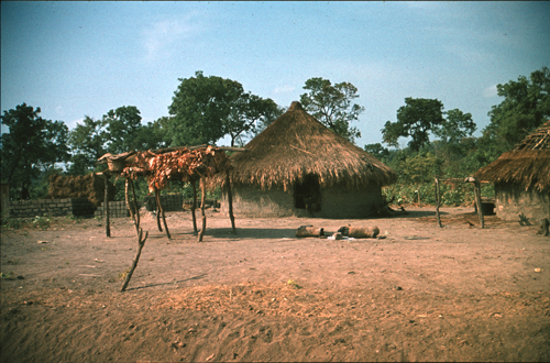 The houses are all small mud creations with a door and two windows. Each is surrounded by a well-swept beaten-earth yard with the family hearth in the centre. This was Sunday, and the most popular leisure-time occupation was to lounge in the yard in front of the house. Several of the groups were singing and dancing to the accompaniment of drums.
