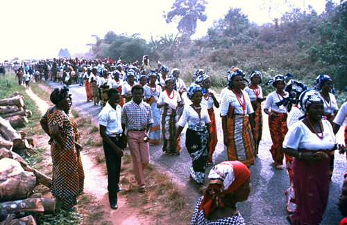 There are many mission churches, some built with red brick and others in the traditional mud-walled style. Since it was Palm Sunday, there were several church processions along the road. The women parishioners throughout the country wear a uniform of teal-blue and canary-yellow. In some villages, the churches were packed with an attentive congregation while in others, the church had been abandoned to be reclaimed by the jungle. The villagers swing to the traditional power of the Witch Doctor and local Chief when not directly under the influence of the missionary with his powerful white magic.